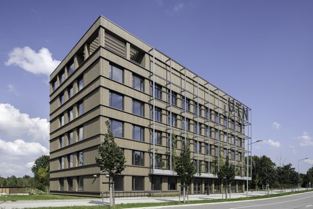 Das Amt für Ernährung, Landwirtschaft und Forsten in Landshut befindet sich im Bau – doch schon jetzt beeindruckt der fünfgeschossige Holzbau mit seiner nachhaltigen Bauweise und der besonderen Aufenthaltsatmosphäre durch das 18 Meter hohe Atrium und die versetzten Galerieebenen. Das Gebäude bietet 100 Arbeitsplätze und ist adressbildend für das „Grüne Zentrum“ Landshut (Planung ArchitekturWerkstatt Vallentin, Ausführung Züblin Timber).