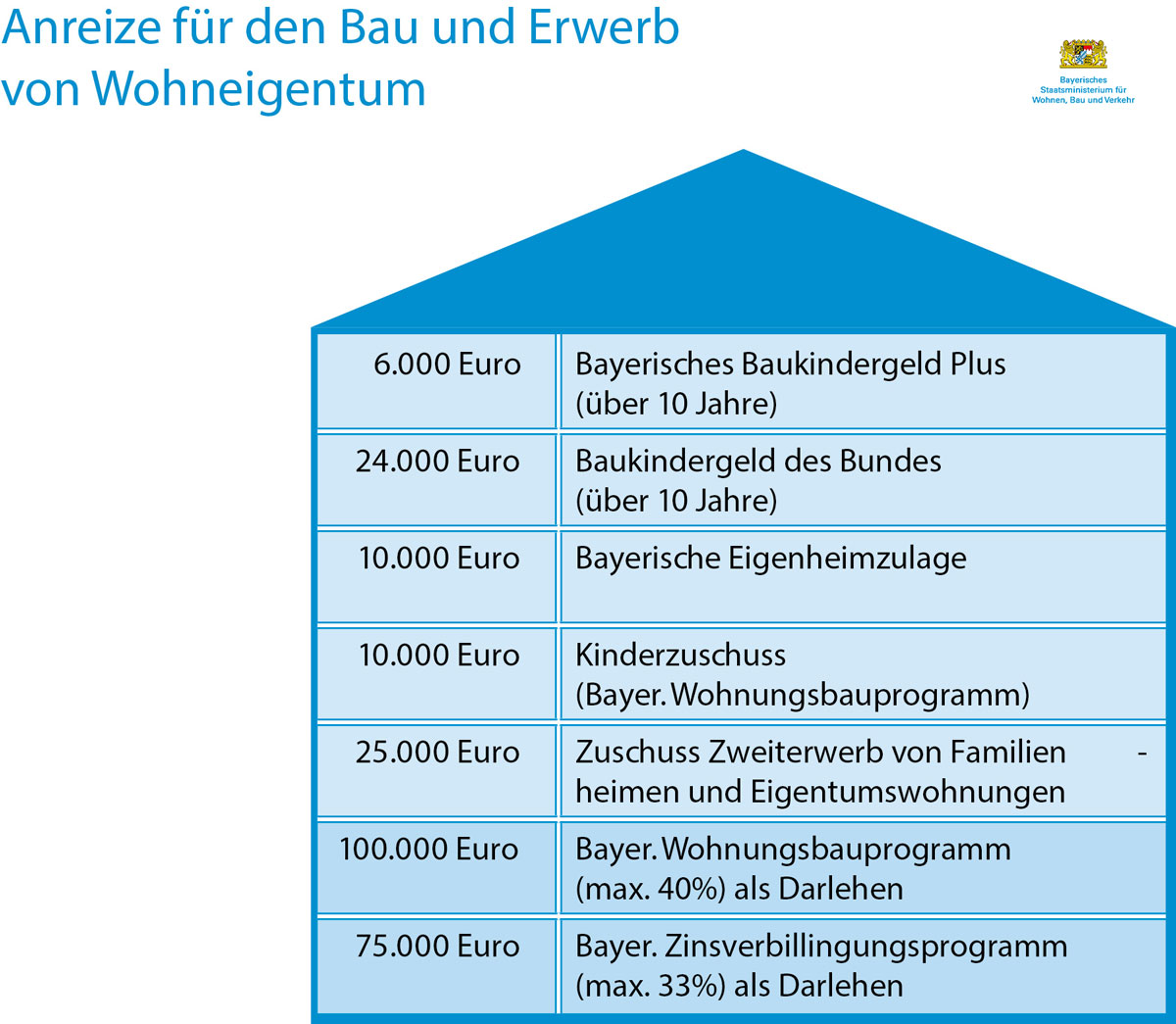 Gerade junge Familien will Aigner beim Bau von einem eigenen Zuhause unterstützen. Das Baukindergeld vom Bund in Höhe von 1.200 Euro pro Kind und Jahr will Aigner mit einem Bayerischen Baukindergeld Plus in Höhe von 300 Euro pro Kind und Jahr erweitern. Die Bauministerin sieht darin Potential für frei werdende Mietwohnungen, die dann wieder auf dem bayerischen Wohnungsmarkt sind. Neben dem Baukindergeld Plus will der Freistaat auch eine bayerische Eigenheimzulage in Höhe von 10.000 Euro einführen.