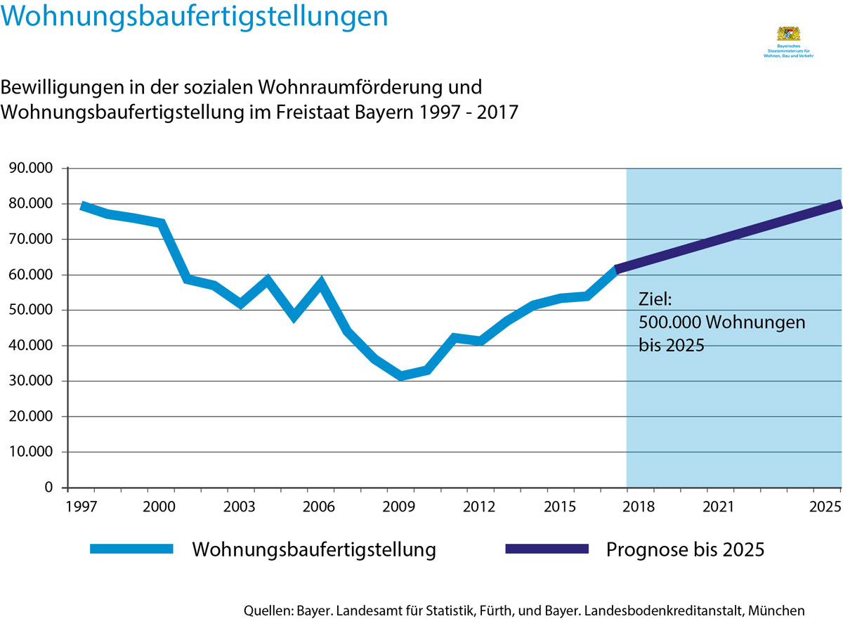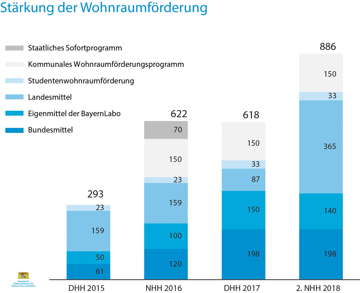 München, 15. Mai 2018 (stmb): Die Bayerische Staatsregierung hat heute ein starkes Maßnahmenpaket beschlossen, um den Wohnungsbau in Bayern zusätzlich zu unterstützen. So will Staatsministerin Aigner sowohl den freifinanzierten als auch den öffentlich geförderten Wohnungsbau mit staatlichen Investitionen anschieben. Mit fast 886 Millionen Euro steht im 2. Nachtragshaushalt 2018 – vorbehaltlich der Zustimmung des Bayerischen Landtags – ein Rekordbetrag für den geförderten Wohnungsbau bereit.