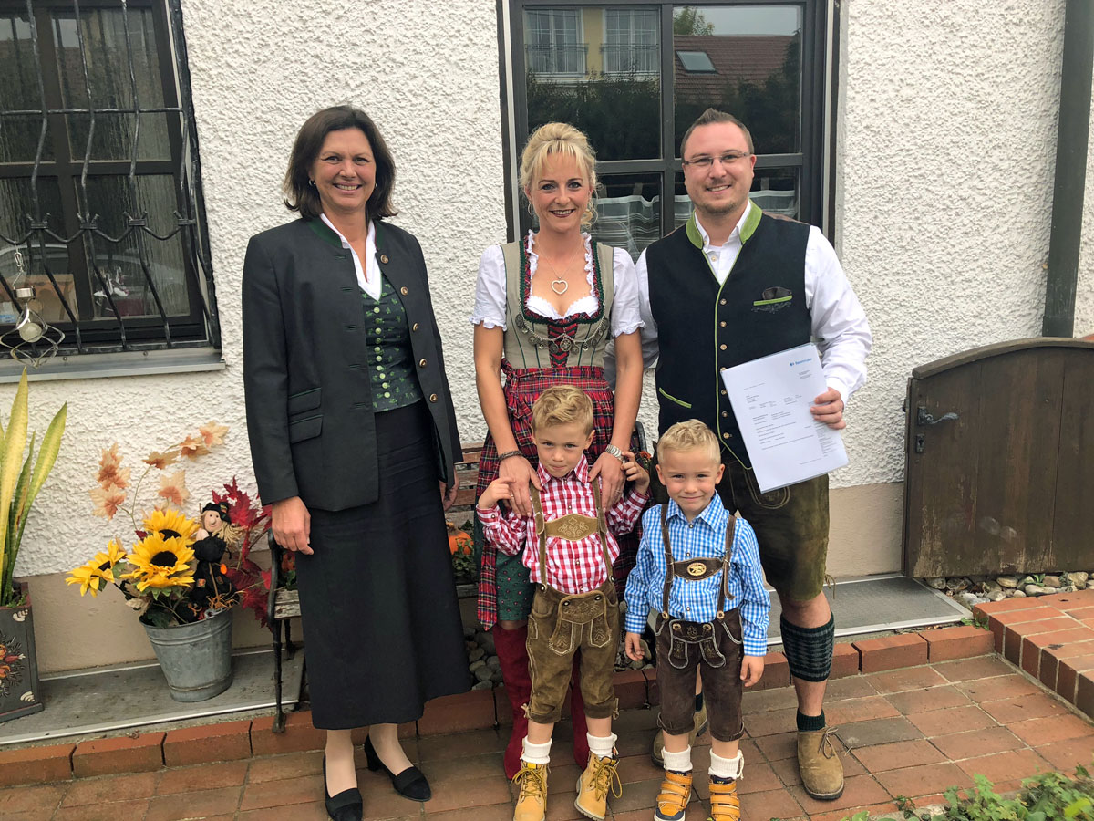 Mauern, 8. Oktober 2018 (stmb). Seit rund einem Monat können Menschen, die sich Wohneigentum zulegen, eine Förderung bei der Bayerischen Landesbodenkreditanstalt (BayernLabo) beantragen. Familie Wistop aus Mauern bei Moosburg bekam heute Besuch von Bayerns Bauministerin Ilse Aigner. Die Familie aus dem oberbayerischen Landkreis Freising zählt zu den ersten, die die staatliche Förderung erhalten. Aigner übergab aus diesem Anlass am gestrigen Sonntag den Förderbescheid an die Familie persönlich.