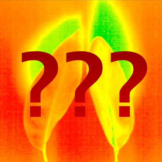 Zwei Pflanzen, die in der Optik eines Energieausweises (Farbspektrum Grün bis Dunkelrot) dargestellt werden. Im Vordergrund drei Fragezeichen