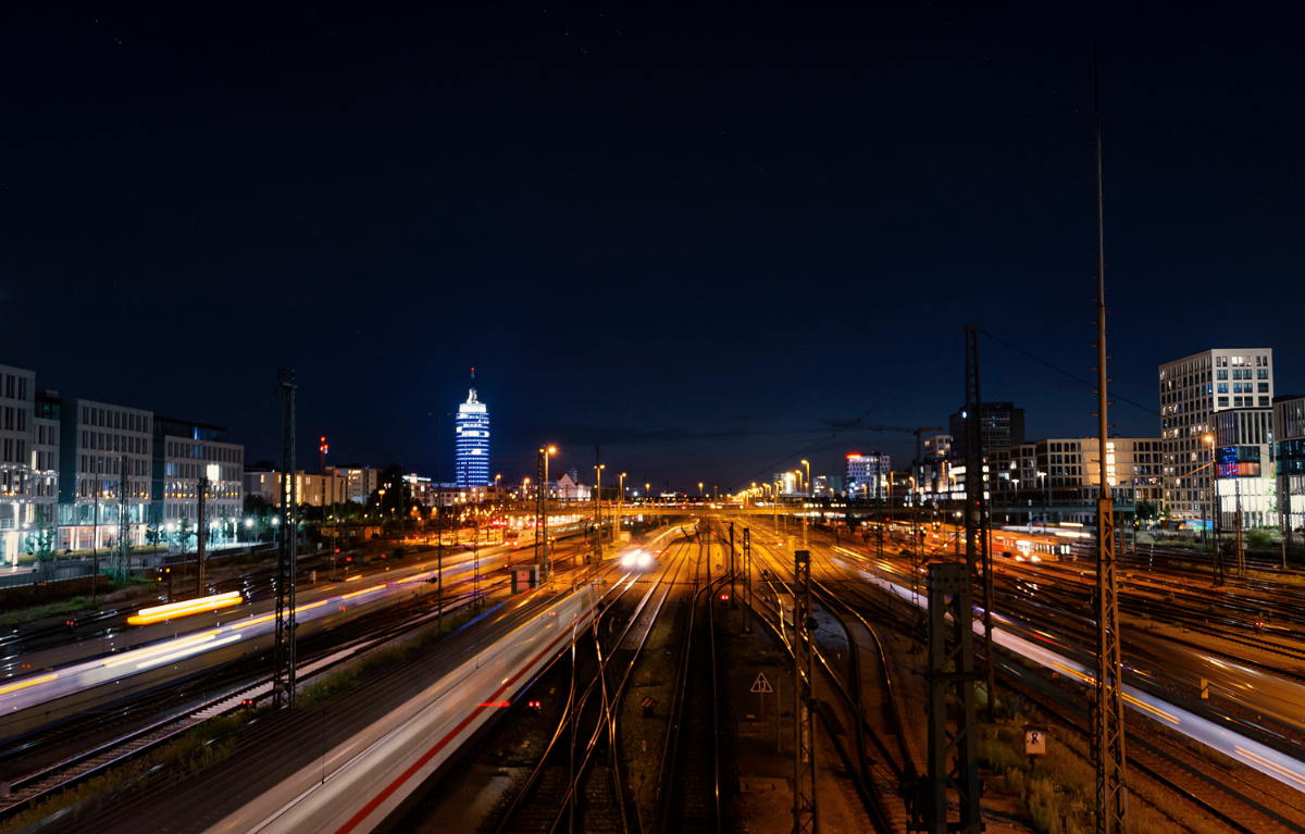 Blick von oben auf die Gleise zum Münchner Hauptbahnhof bei Nacht. Es sind beleuchtete Häuser und Lichter sowie verschwommen fahrende Züge zu erkennen.