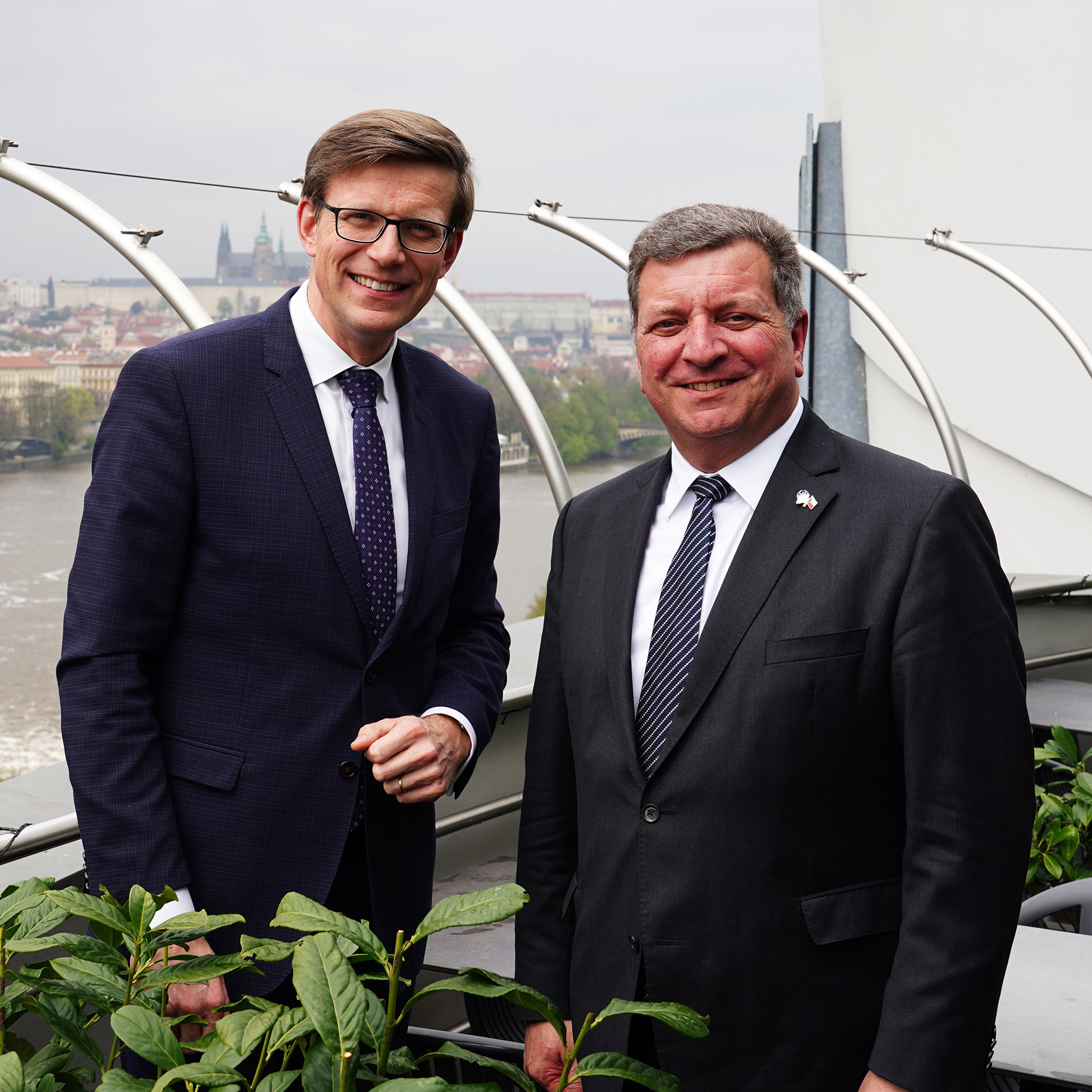 Prag, 20. April 2023. Bayerns Verkehrsminister Christian Bernreiter hat sich in Prag mit dem tschechischen Minister für Verkehr Martin Kupka über die Herausforderungen im länderverbindenden Verkehr zwischen Tschechien und Bayern ausgetauscht. Seit dem Ende des Eisernen Vorhangs und dem EU-Beitritt Tschechiens 2004 wächst die Grenzregion immer stärker zusammen.