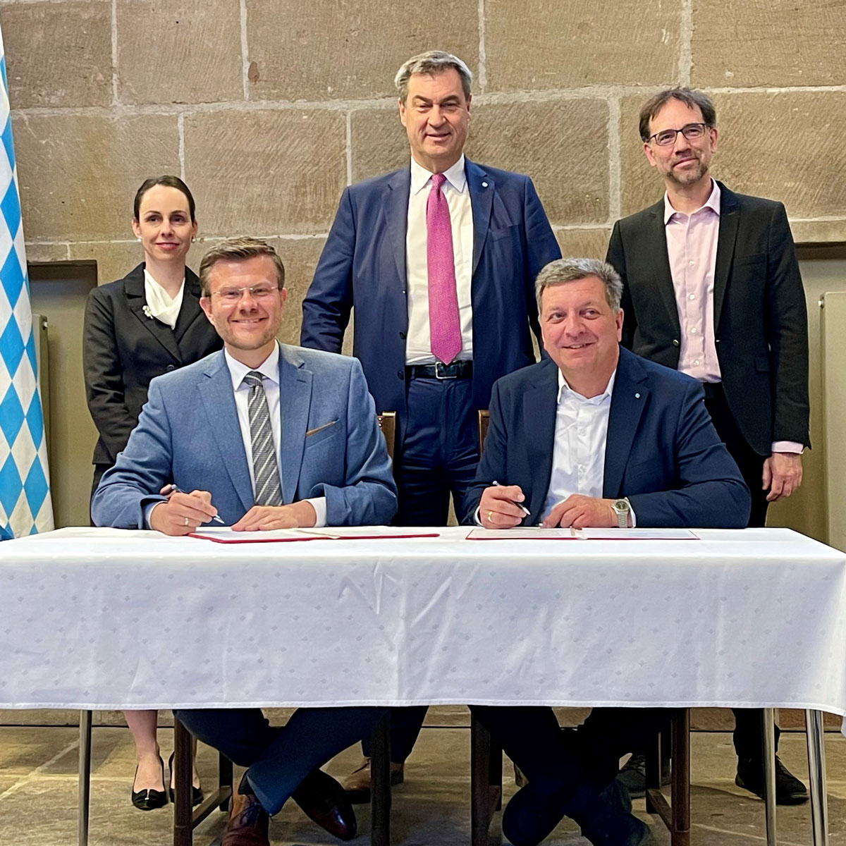 Oberbürgermeister Marcus König und der bayerische Verkehrsminister Christian Bernreiter unterzeichnen im Beisein von Bayerns Ministerpräsident Dr. Markus Söder sowie Wirtschaftsreferentin Dr. Andrea Heilmaier und Baureferent Daniel F. Ulrich den Letter of Intent für eine Machbarkeitsstudie für eine Magnetschwebebahn in Nürnberg