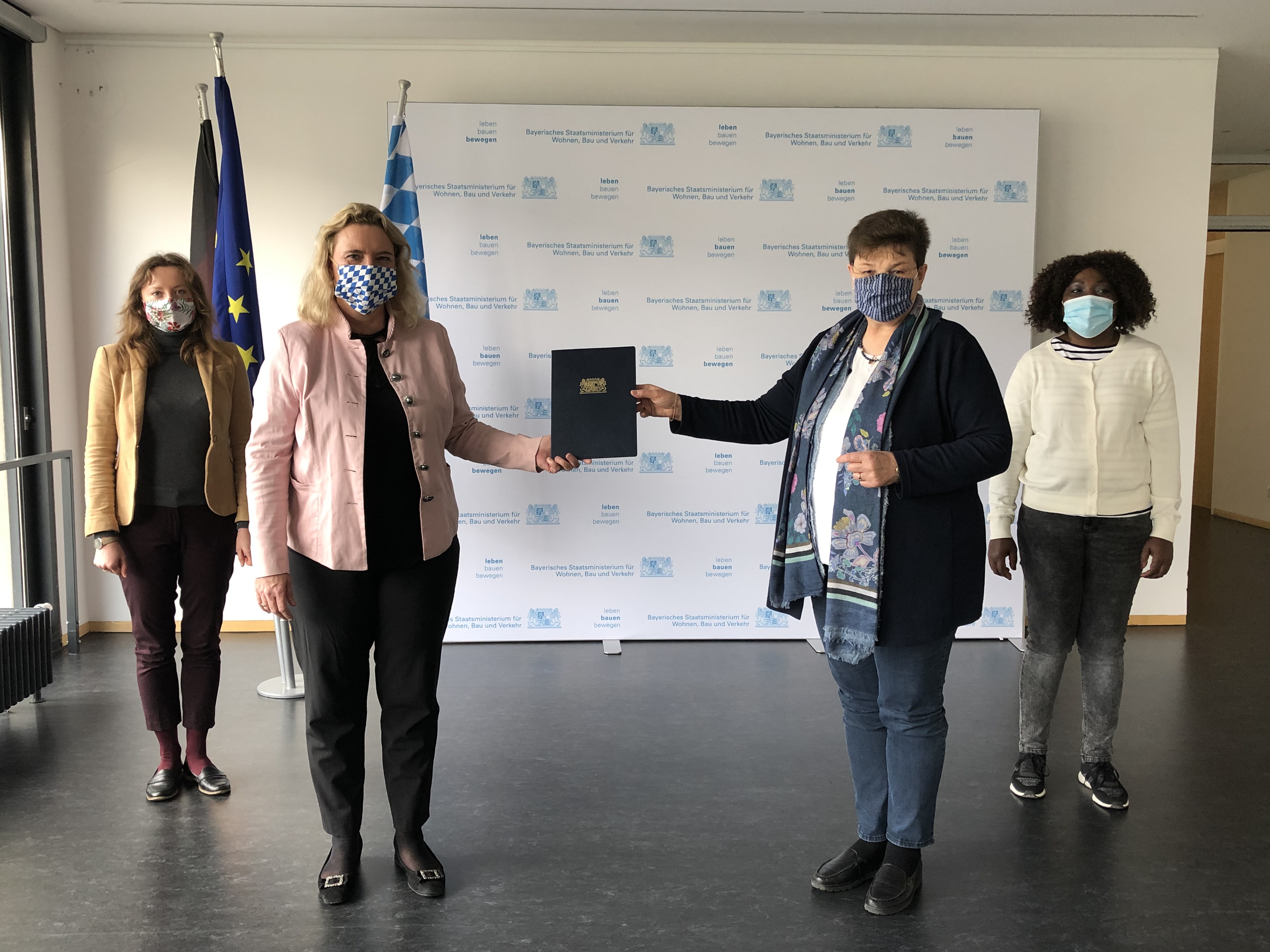 Das Bayerische Bau- und Verkehrsministerium bekommt Zuwachs: Im Rahmen eines Projekts der Caritas zur Inklusion psychisch belasteter Menschen werden ab 1. November 2020 sechs Männer und Frauen den hausinternen Botendienst unterstützen. Staatsministerin Kerstin Schreyer hat heute mit Caritas-Vorständin Gabriele Stark-Angermeier den Vertrag unterschrieben: „Wir wollen unseren Teil dazu beitragen, Menschen mit psychischen Belastungen eine Tagesstruktur zu geben und ihnen eine Teilhabe am Leben in der Gesellschaft zu ermöglichen. Ich freue mich sehr auf die neuen Kolleginnen und Kollegen und heiße sie herzlich willkommen!“, so die Ministerin.