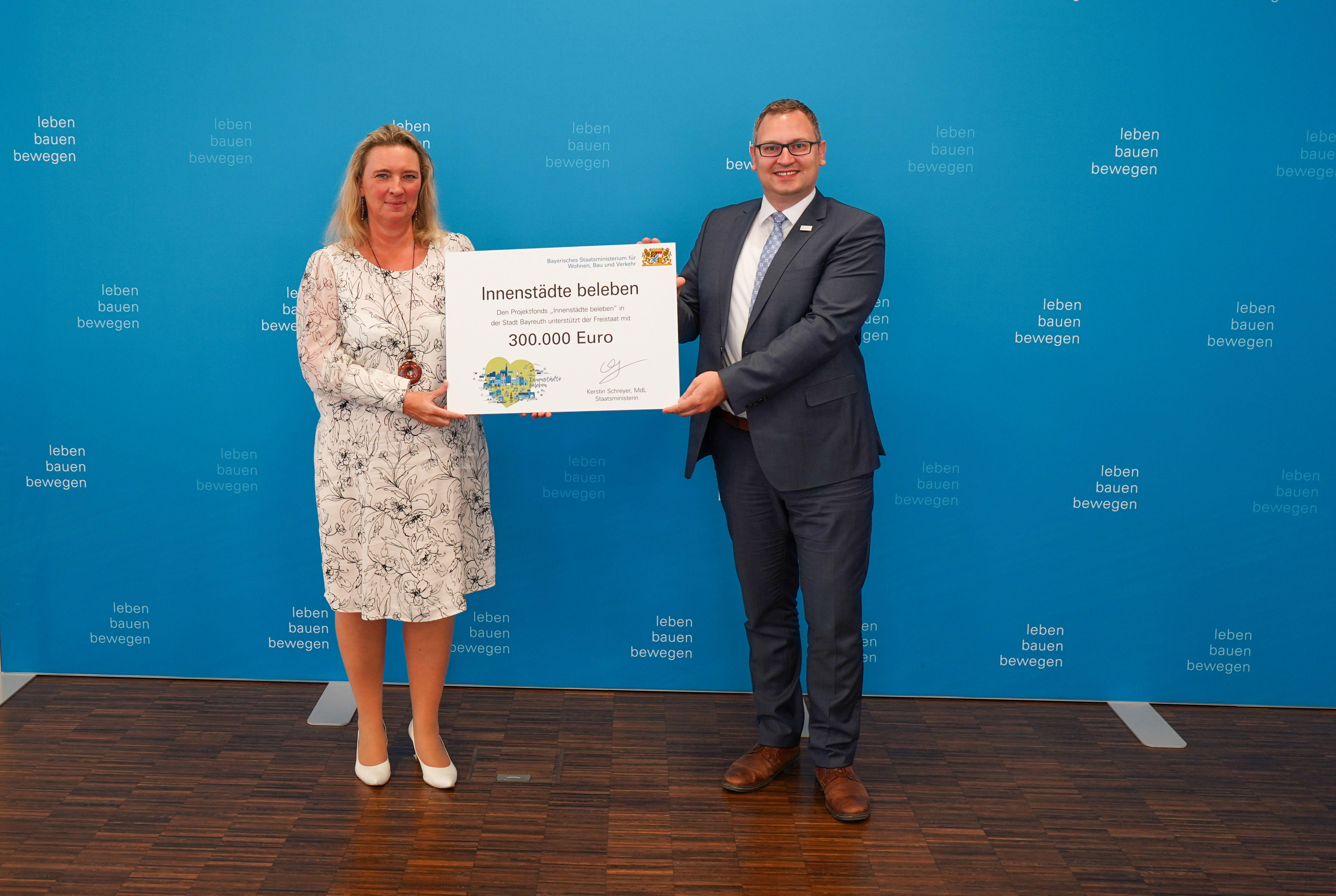 Das Bauministerium hat heuer einmalig 100 Millionen Euro für den Sonderfonds „Innenstädte beleben“ bereitgestellt. Mit den Mitteln werden Städte, Märkte und Gemeinden bei der Stärkung und Erhaltung ihrer Ortskerne unterstützt. Bauministerin Kerstin Schreyer hat nun die ersten Förderbescheide überreicht: „Die Stadt Bayreuth erhält für ihren ‚Projektfonds Innenstädte beleben‘ 300.000 Euro. Wir unterstützen sie damit bei der Belebung und Stärkung der Innenstadt.“