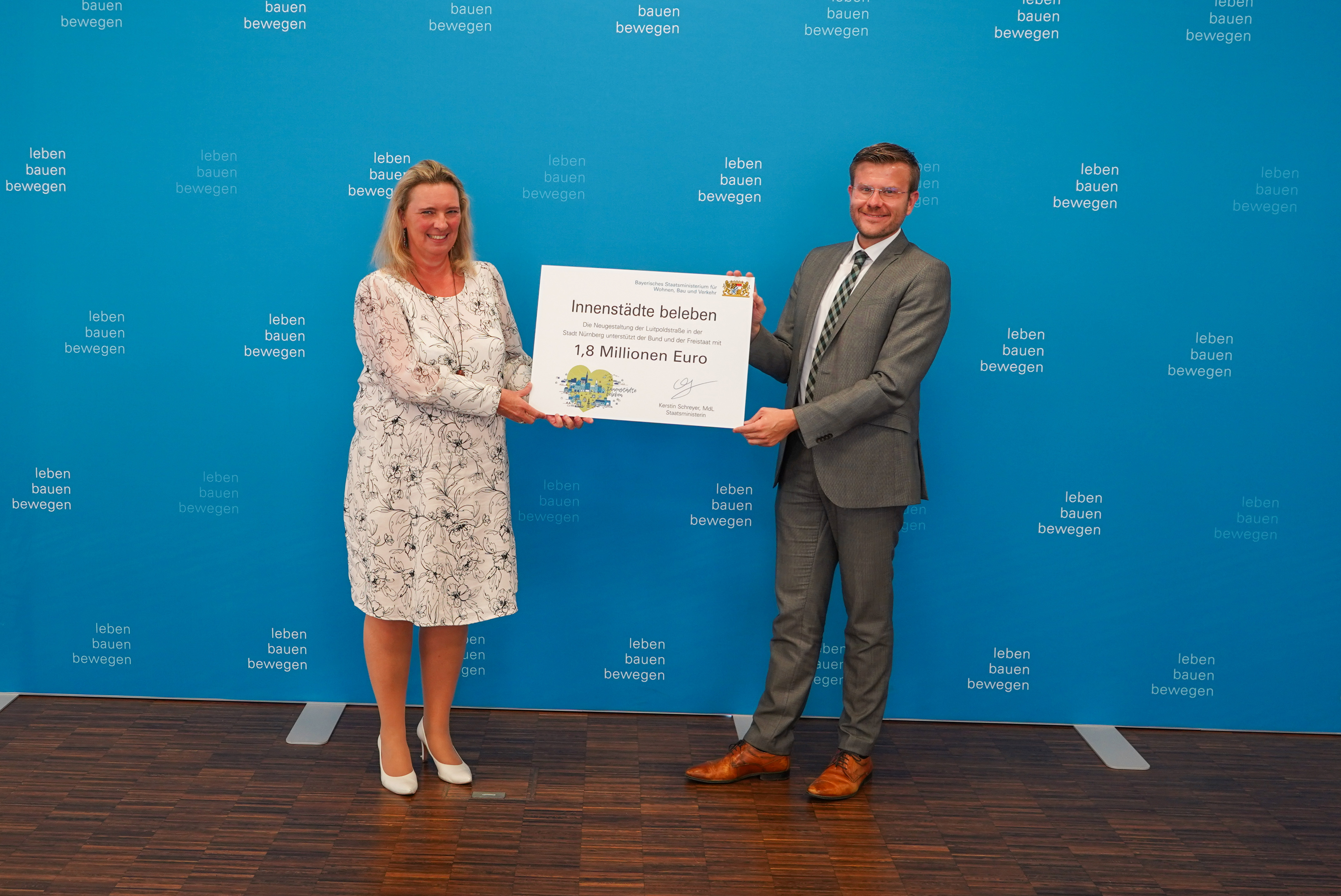 Das Bild zeigt Bauministerin Kerstin Schreyer bei der Übergabe des Förderbescheids an Nürnbergs Oberbürgermeister Marcus König (Quelle: StMB)