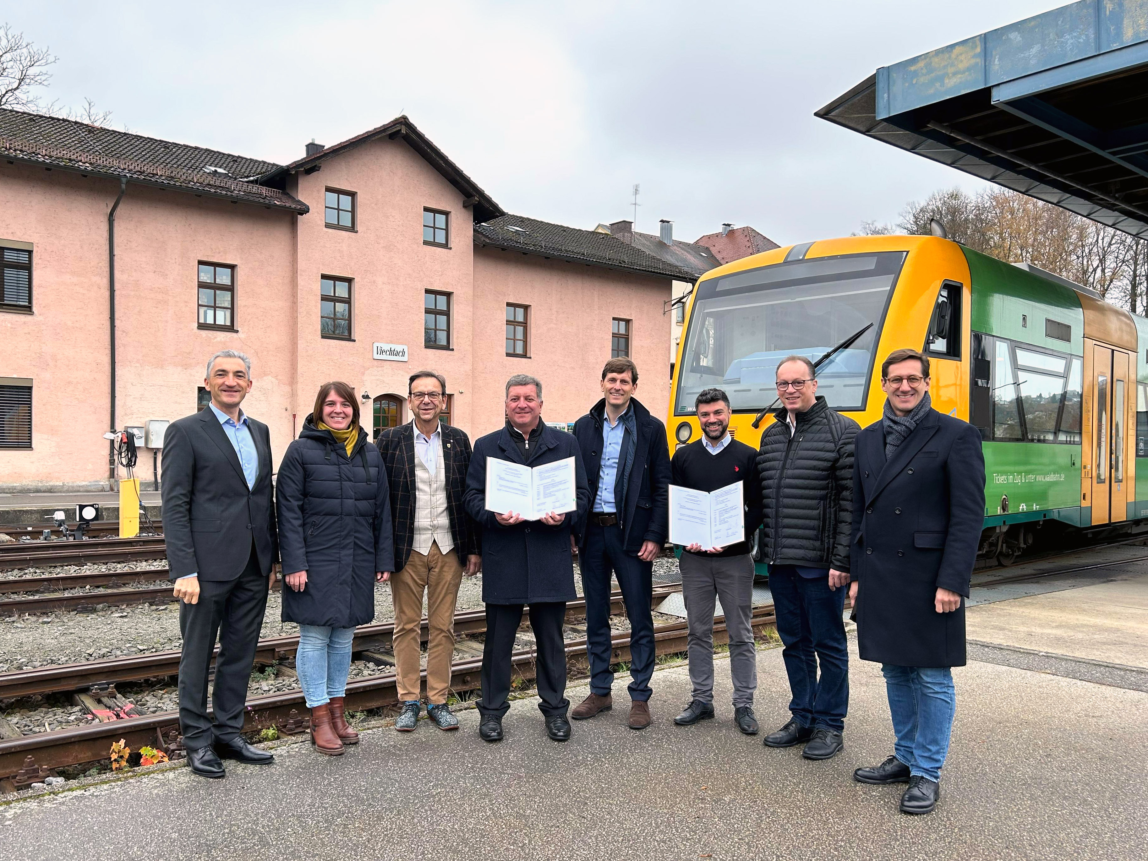Die Vorbereitungen zur Umstellung des Netzes „Bayerwald“ auf Akku-Züge schreiten weiter voran. Der Freistaat hat heute die Länderbahn mit den Planungen für die Akku-Ladestation in Viechtach beauftragt. Bei der Vertragsunterzeichnung betonte Bayerns Verkehrsminister Christian Bernreiter: „Wir machen die Bahnstrecke Gotteszell – Viechtach fit für die Zukunft. Nach der Entscheidung für den Dauerbetrieb stellen wir nun die Weichen für eine Umstellung auf klimafreundliche Antriebe.“