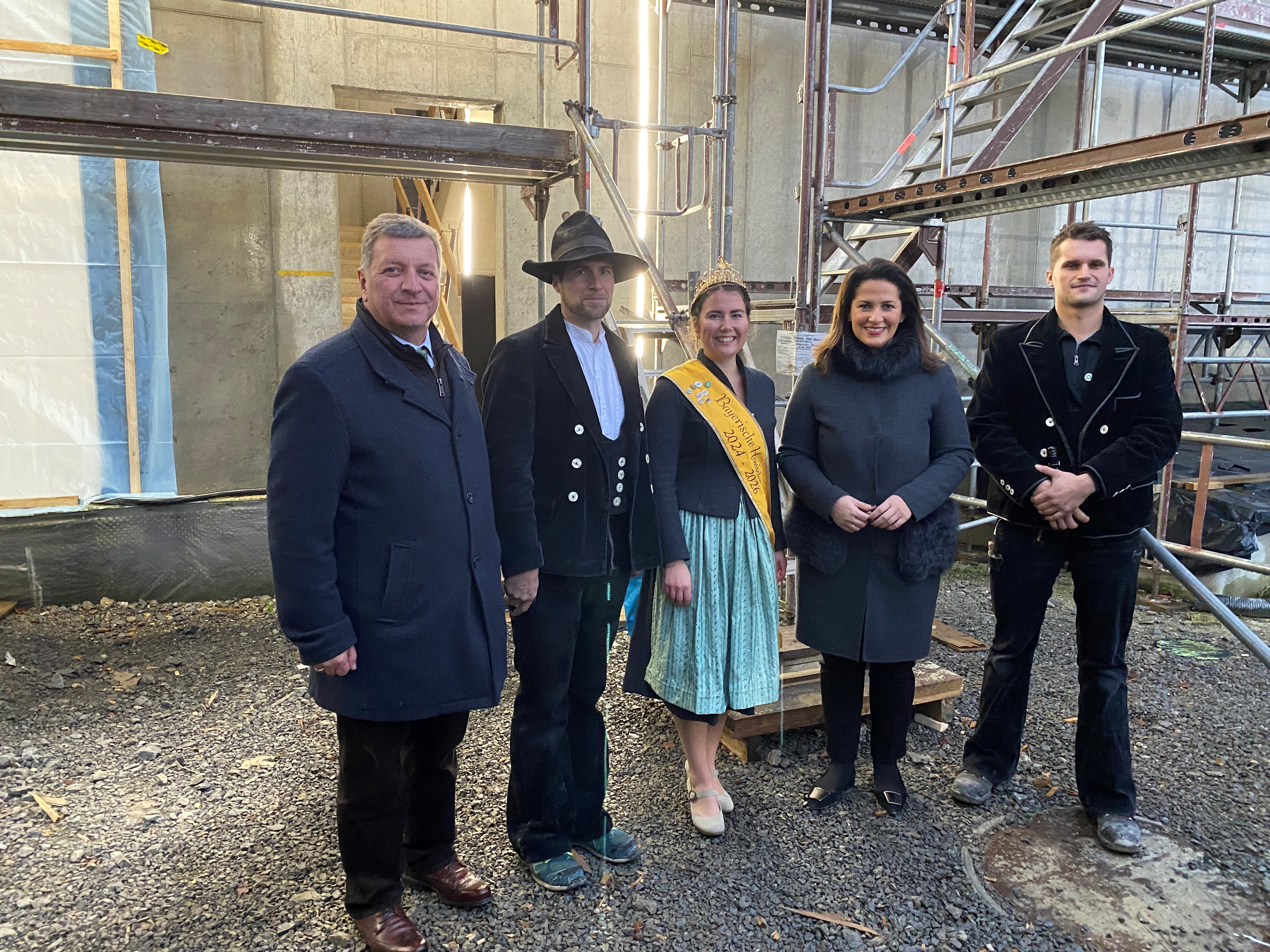 Foto: Bayerns Bauminister Christian Bernreiter und Landwirtschaftsministerin Michaela Kaniber zusammen mit Handwerksleuten und der Bayerischen Honigkönigin beim Richtfest